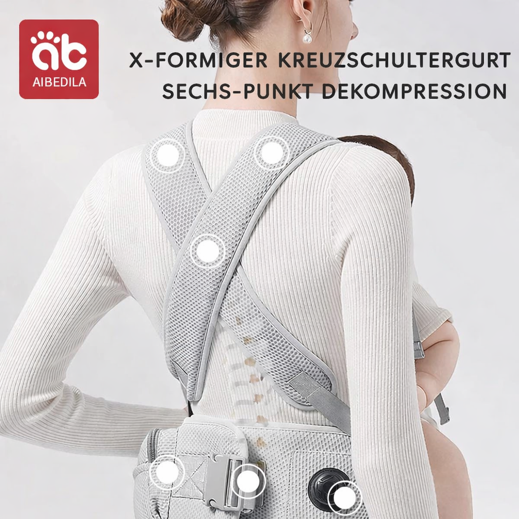 Das X-förmige Gurtsystem verteilt den Druck gleichmäßig und schützt so Rücken, Taille und Hüfte vor Überlastung. Es verhindert außerdem ein Verrutschen oder Kippen der Babytrage und sorgt so für Stabilität und Komfort für Sie und Ihr Baby bei Spaziergängen oder Erledigungen.
