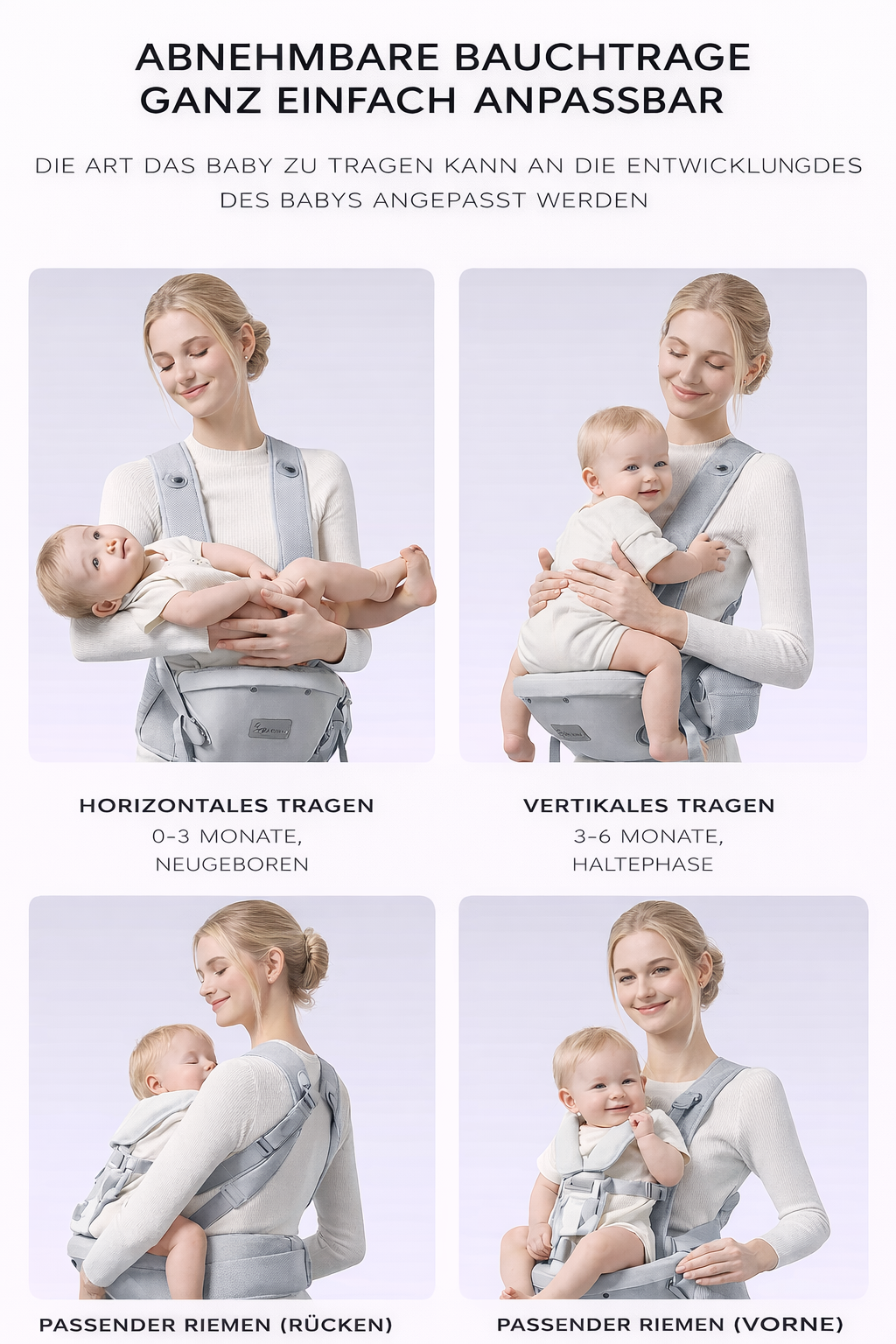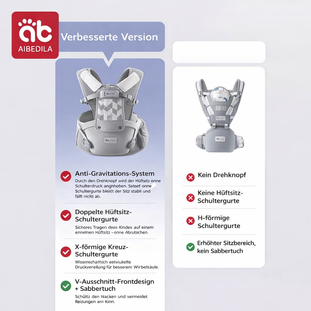 Unser verbesserter Anti-Schwerkraft-Knopf verteilt das Gewicht Ihres Babys gleichmäßig auf Taille und Schultern und verhindert so die bei herkömmlichen Tragen häufig auftretende Bauchbelastung. Die beiden Haltegurte lassen sich sicher fixieren, sodass Sie Ihr Kind stundenlang ermüdungsfrei tragen können.